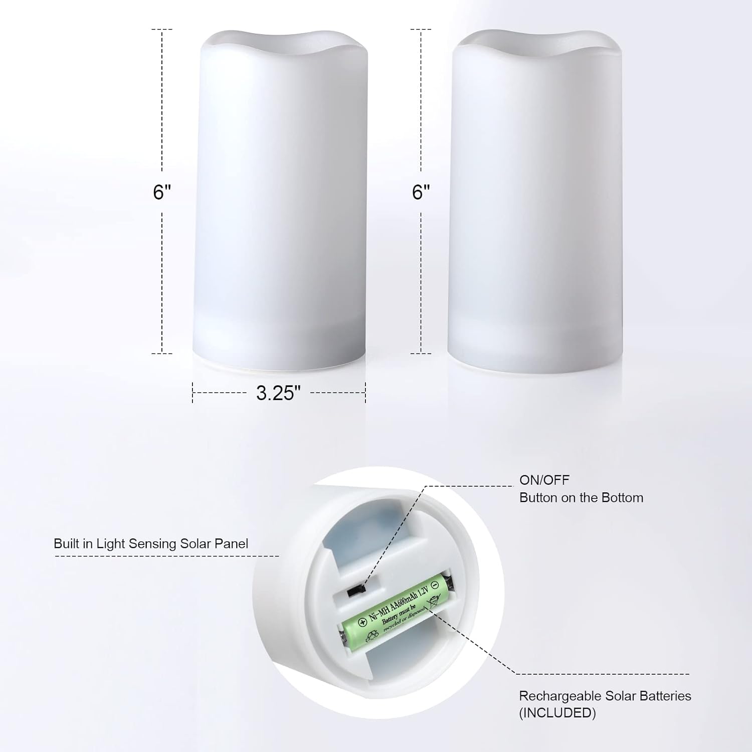 Solar flameless Candles Outdoor Waterproof,Dusk to Dawn Outdoor Lighting, Flickering fameless Reusable LED Light Candles for Lantern Garden Camping and Home Decor, 3D Wick (3"X6") Set of 2