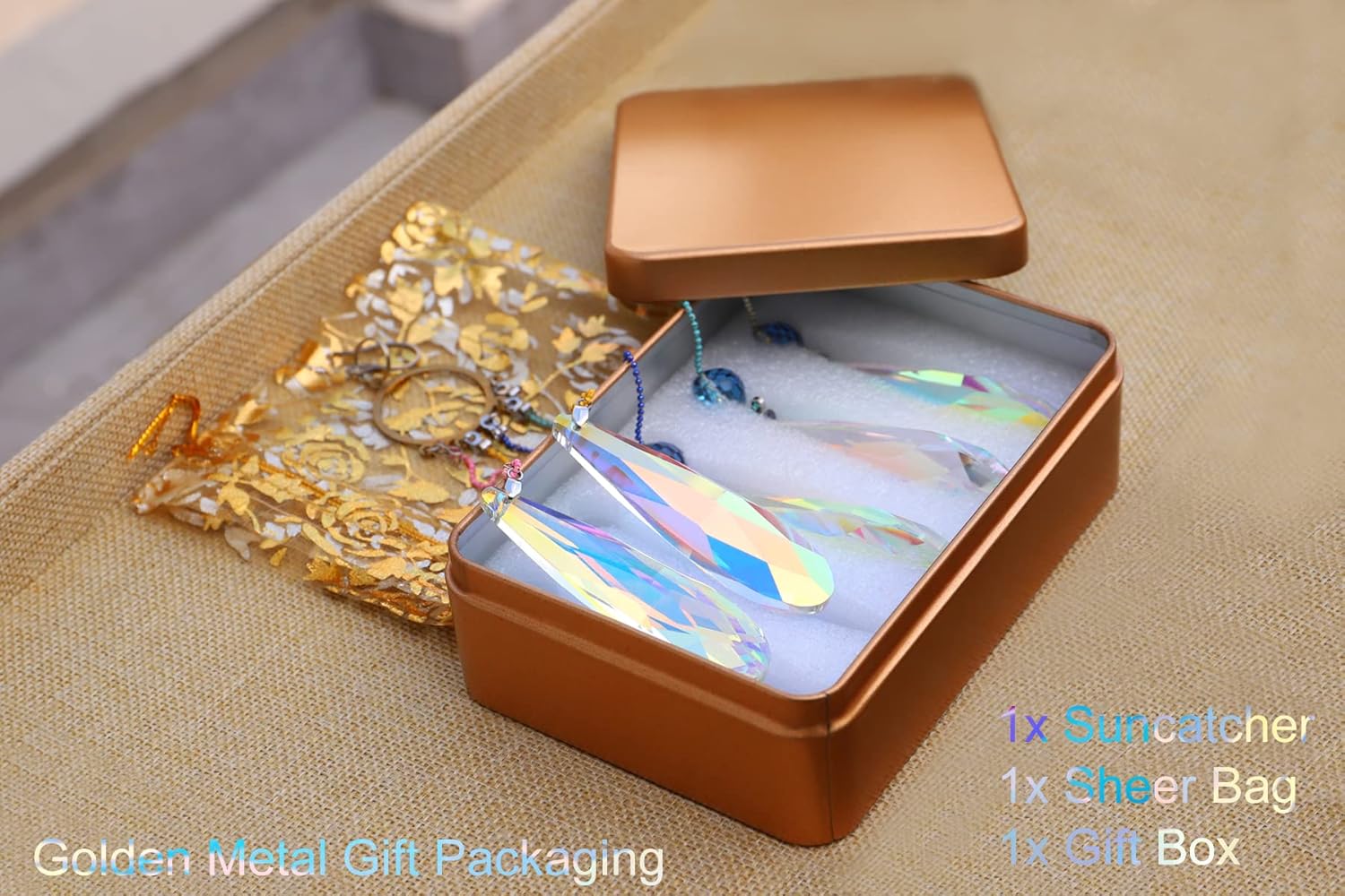 - SPECIFICATION: Color AB Premium Quality Teardrop Prismatic Crystal Pendants 73mm(2.9")x20mm(0.79") + Colors Rainbow Copper Chains + Stainless Steel Hook + Other accessories are stainless steel. This suncatcher is made of high quality crystal glass, copper and stainless steel materials, can keep shining year by year whether indoor or outdoor, in the wind and rain or sun