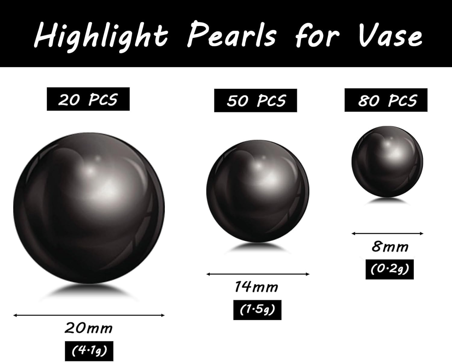 150Pcs Black Polished No Hole Faux Pearl Beads for Vase Filling Decorations, Plastic Pearls Vase Fillers, Table Scatters, Wedding Centerpiece, Home Decor, 8/14/20 mm