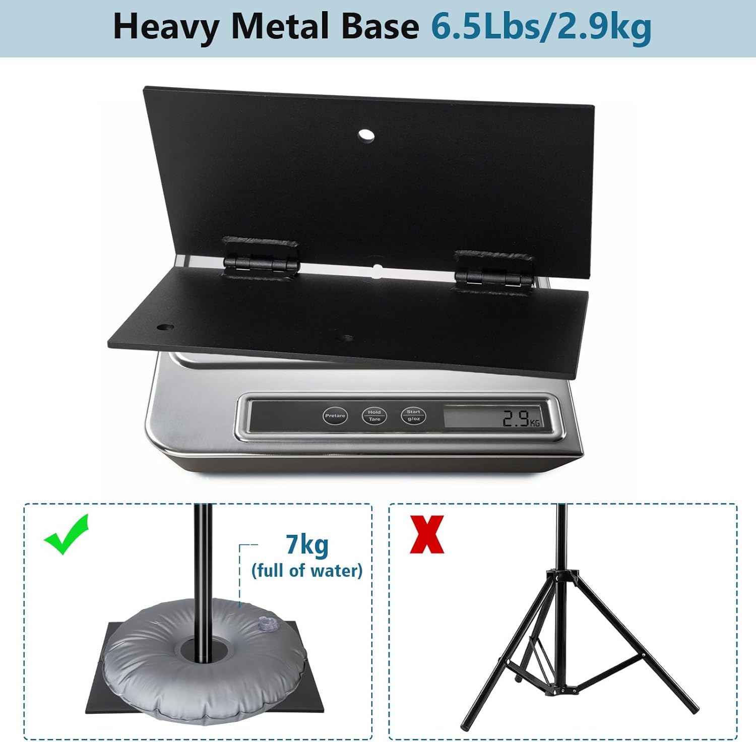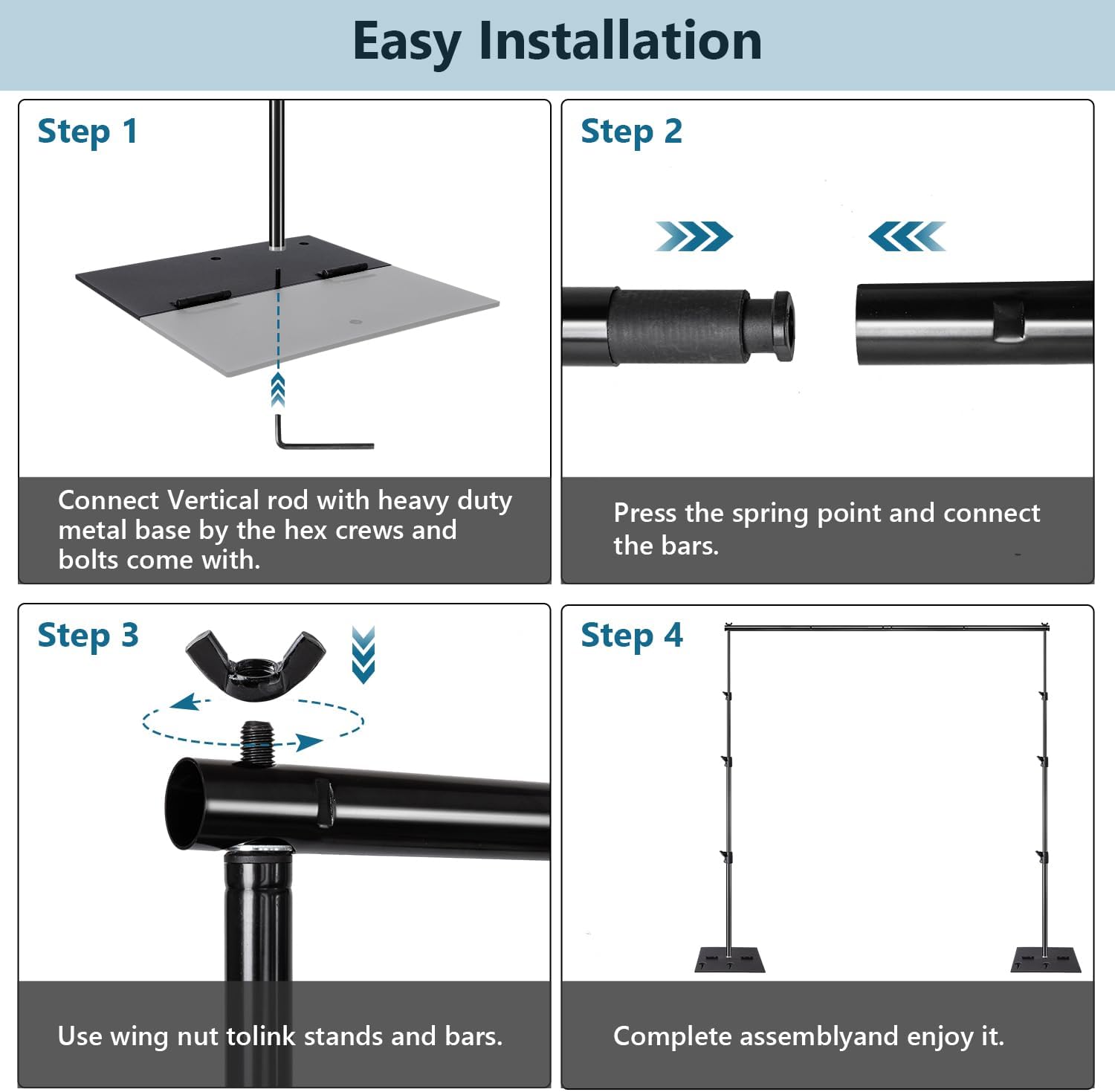 - [2 x Heavy Metal Base] The Base is made of high-quality iron.4.6kg/1pcs Metal Base.It can avoid the more space.[2 x Water weight bag] You can use the water bag with some water to increase the stability. [6 x Metal Ground Nails to fix the bases] ensure a strong hold for those extra heavy backdrops when you use the stand kit when outside using