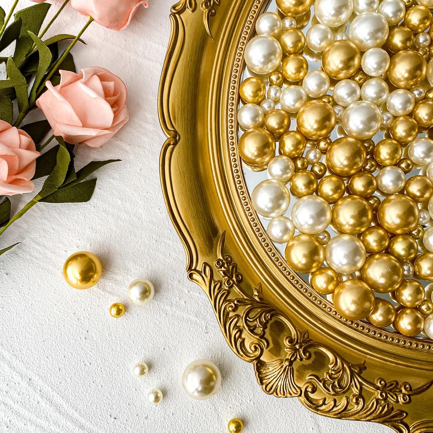 180PCS Cream Gold Beads for Centerpieces Vases, No Hole Polished Pearl Makeup Beads Mixed 8/14/20mm Sizes, Pearl Vase Fillers Table Scatters for Party Wedding Decor