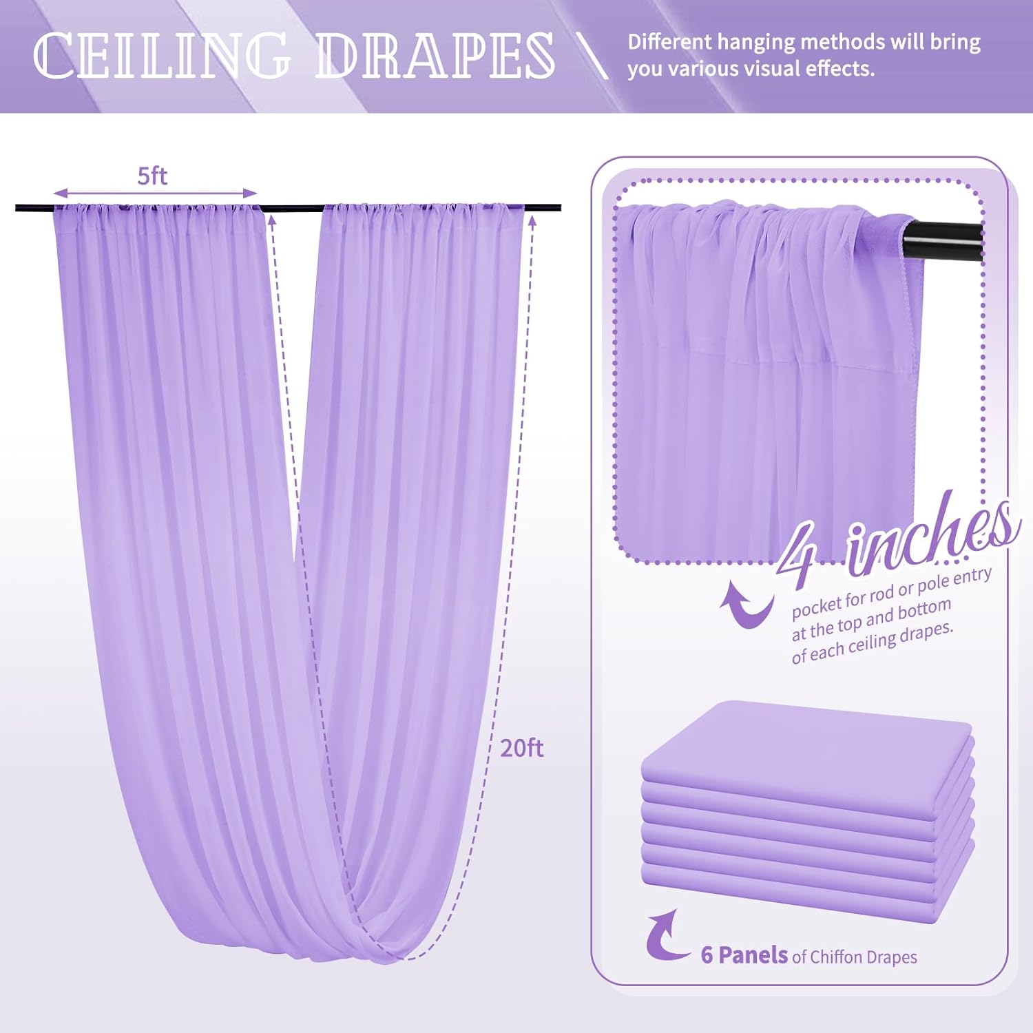 6 Panels Lavender Ceiling Drapes for Wedding 5ftx20ft Chiffon Fabric Arch Draping Curtains Sheer Drapery for Party Ceremony Birthday Baby Shower Reception Stage Swag Ceiling Decorations