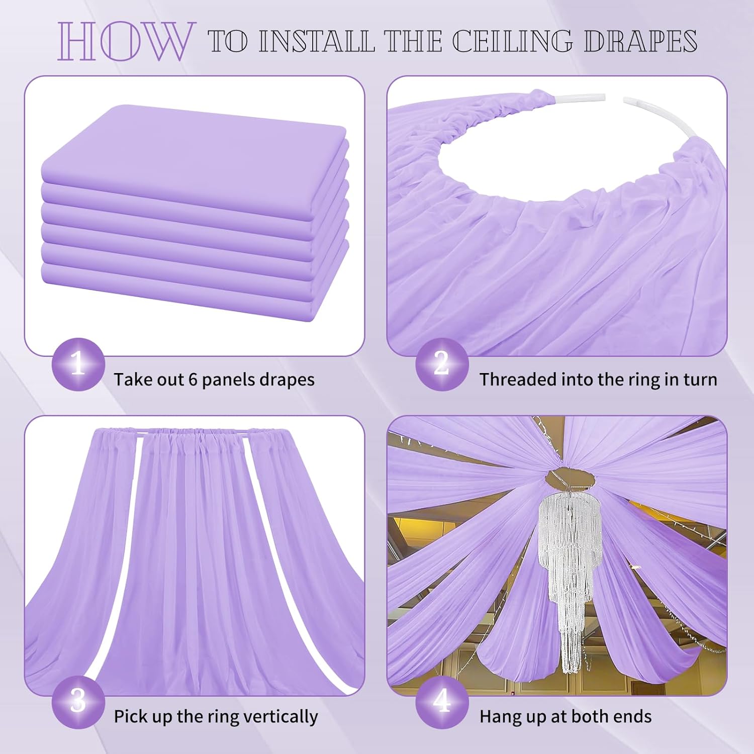 - 【Chiffon Fabric Curtain】The package will include 6 panels lavender wedding ceiling drapes (Not include stand !!!), each wedding extra long curtain measures 5 feet(60inch)wide x20 feet(240inch) long. Sufficient quantity can meet your needs. These arch draping are applicable for any indoor and outdoor occasion either for decorative or functional uses.