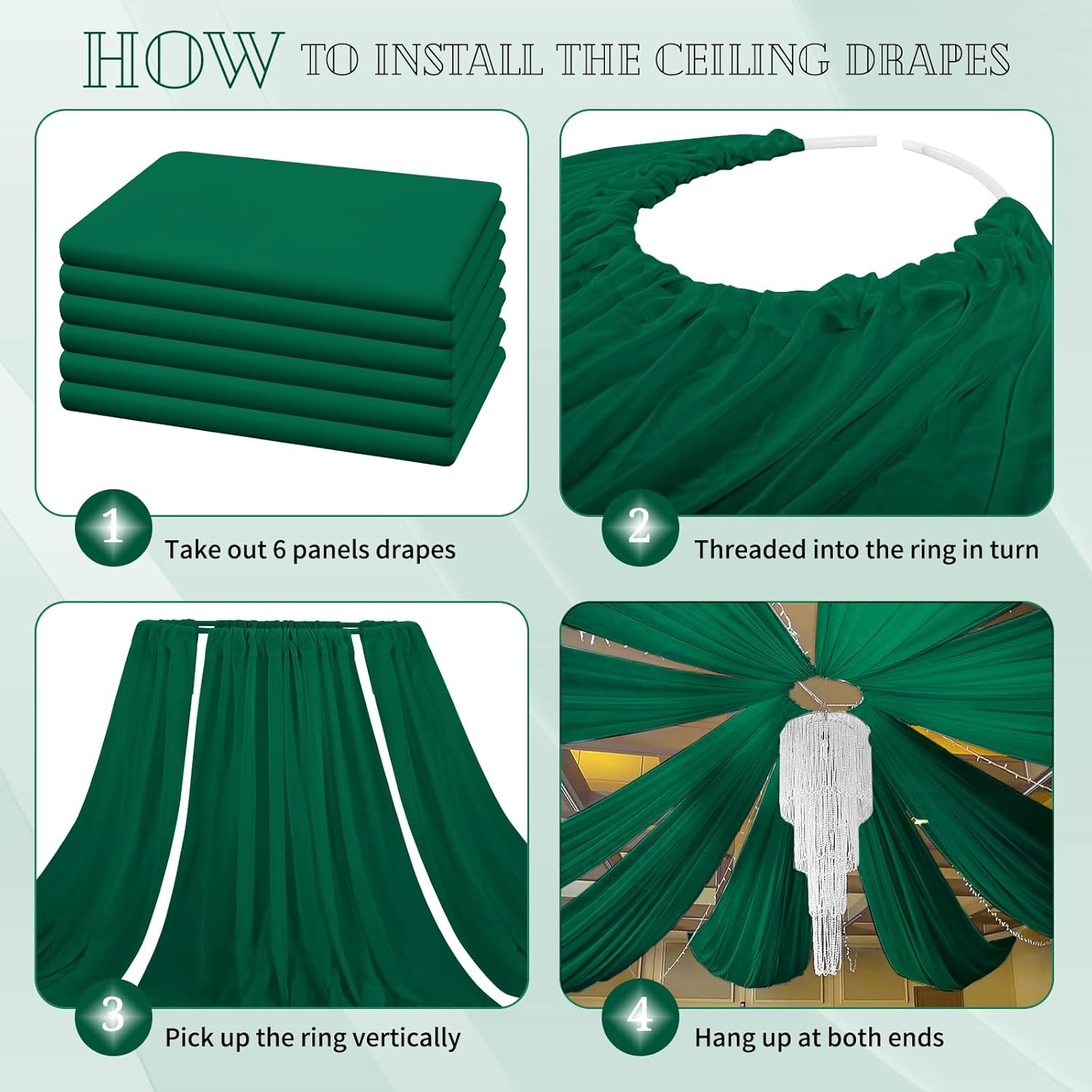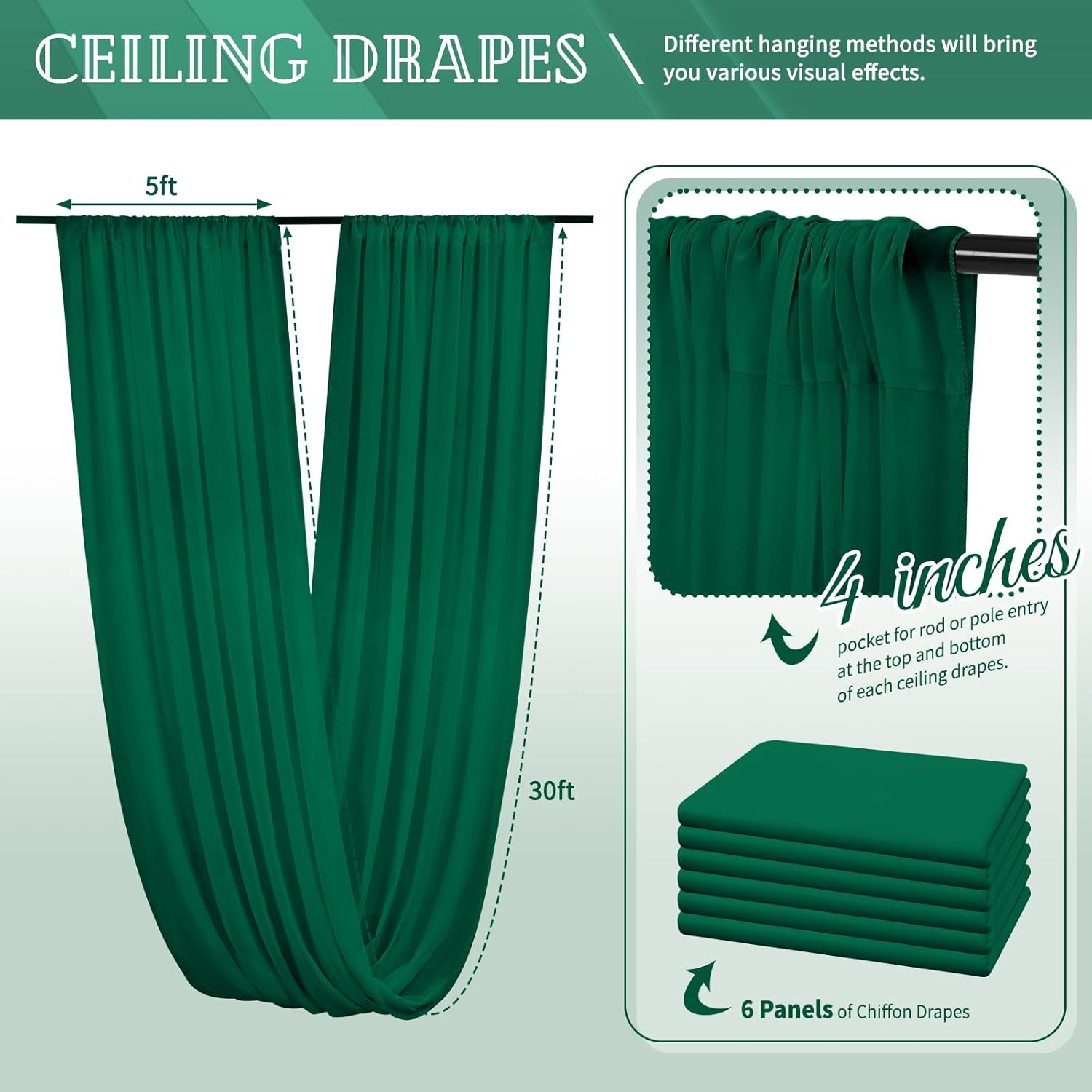 6 Panels Emerald Green Ceiling Drapes for Wedding 5ftx30ft Chiffon Fabric Arch Draping Curtains Sheer Drapery for Party Ceremony Birthday Baby Shower Reception Stage Swag Ceiling Decorations