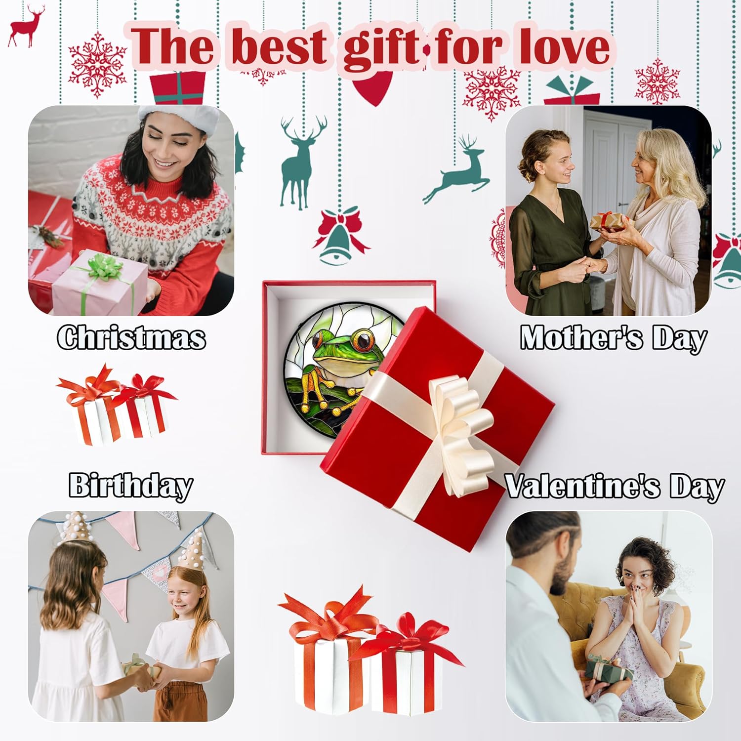 Stained Glass Window Hanging, Green Frog White Petals Sun Catchers Colorful Glass Panel Cute Suncatcher Decor for Birthday for Women, Men, Wife, Aunt, and Mom 14.9x14.9 in