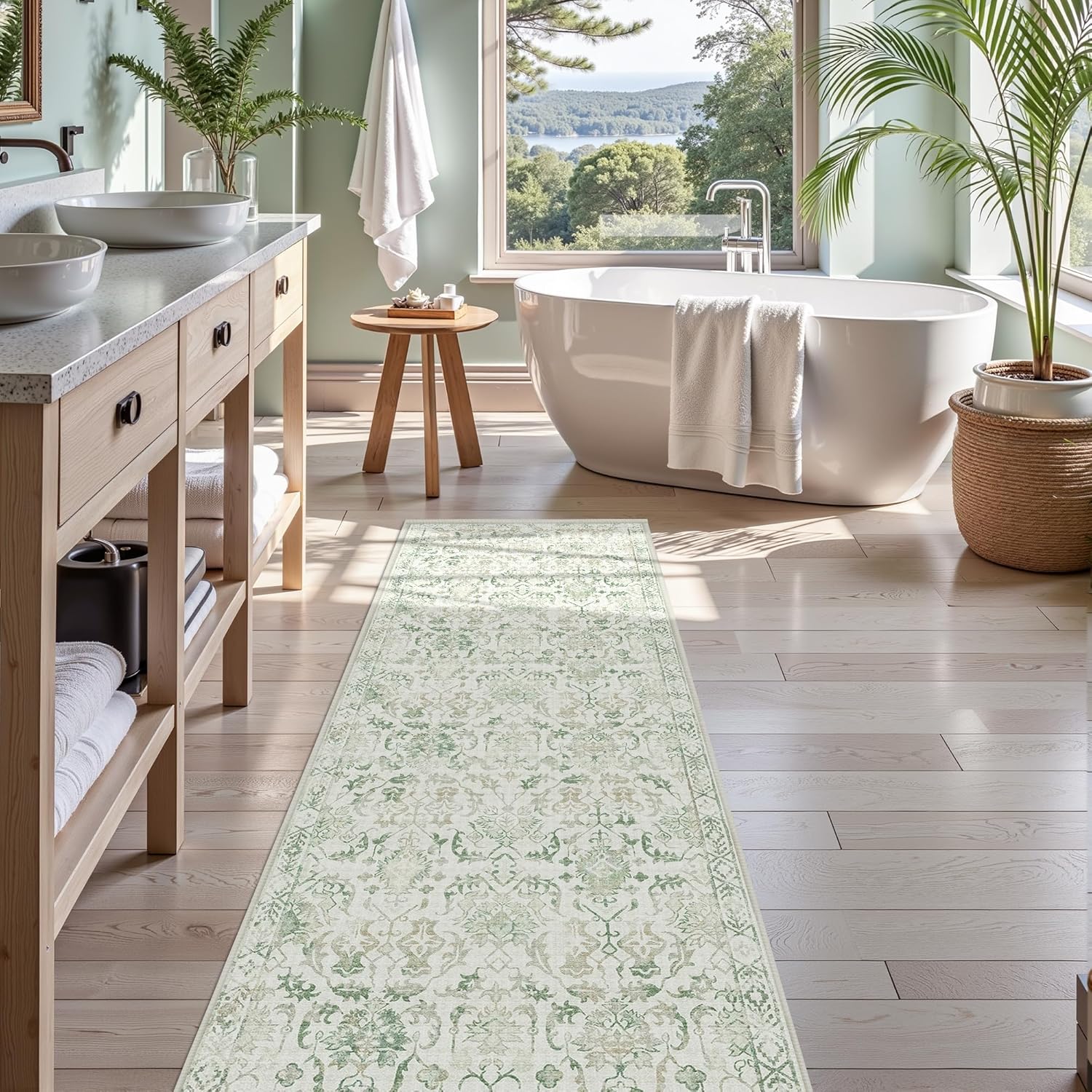 Green 3x7 Runner Rug for Hallways Bed Side Kitchen, Boho Washable Distressed Low-Pile Floor Entryway Long Bathroom Mat, Non-Slip Laundry Room Washstand Front Carpet Green 36x84 Inch