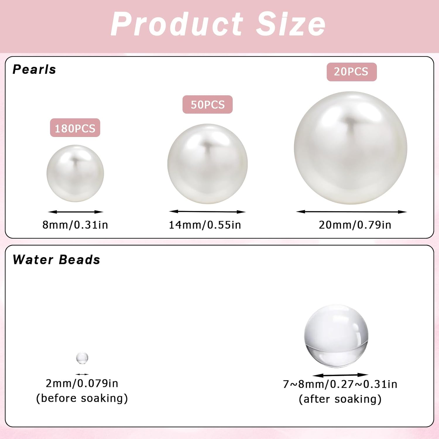 - 【Hapforever Package】: You will receive 250 pearl beads in three versatile sizes: 8mm (180 pcs), 14mm (50 pcs), and 20mm (20 pcs). Combined with 4000 clear water beads, these vase fillers create a stunning floating effect, ideal for enhancing floral arrangements and centerpieces