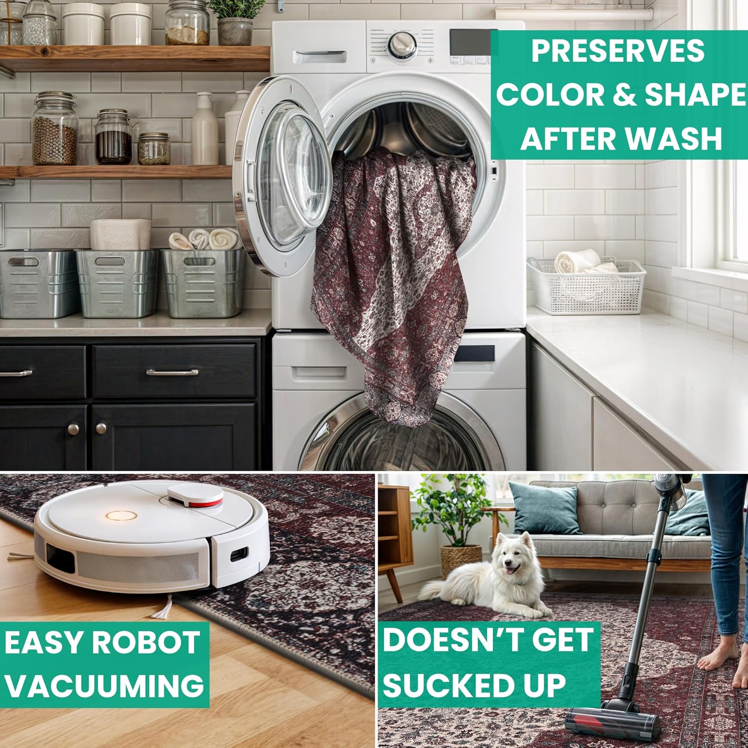 - MACHINE WASHABLE: Machine wash on delicate cycle (do not use bleach) at 85°F (30°C) and line dry or dry on air-only cycle without heat. Vacuum regularly and spot clean small stains. This easy to clean rug is perfect for families with kids and pets, and for high traffic areas.