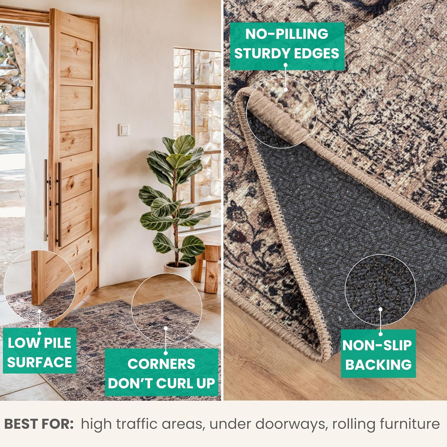 • EASY TO SETUP AND NON-SLIP: This one-piece machine washable rug with non-slip backing attached eliminates any additional setup. Simply unfold and lay flat upon arrival in the desired space. Non-slip backing prevents the rug from moving or sliding without the need for additional rug pad or grippers.