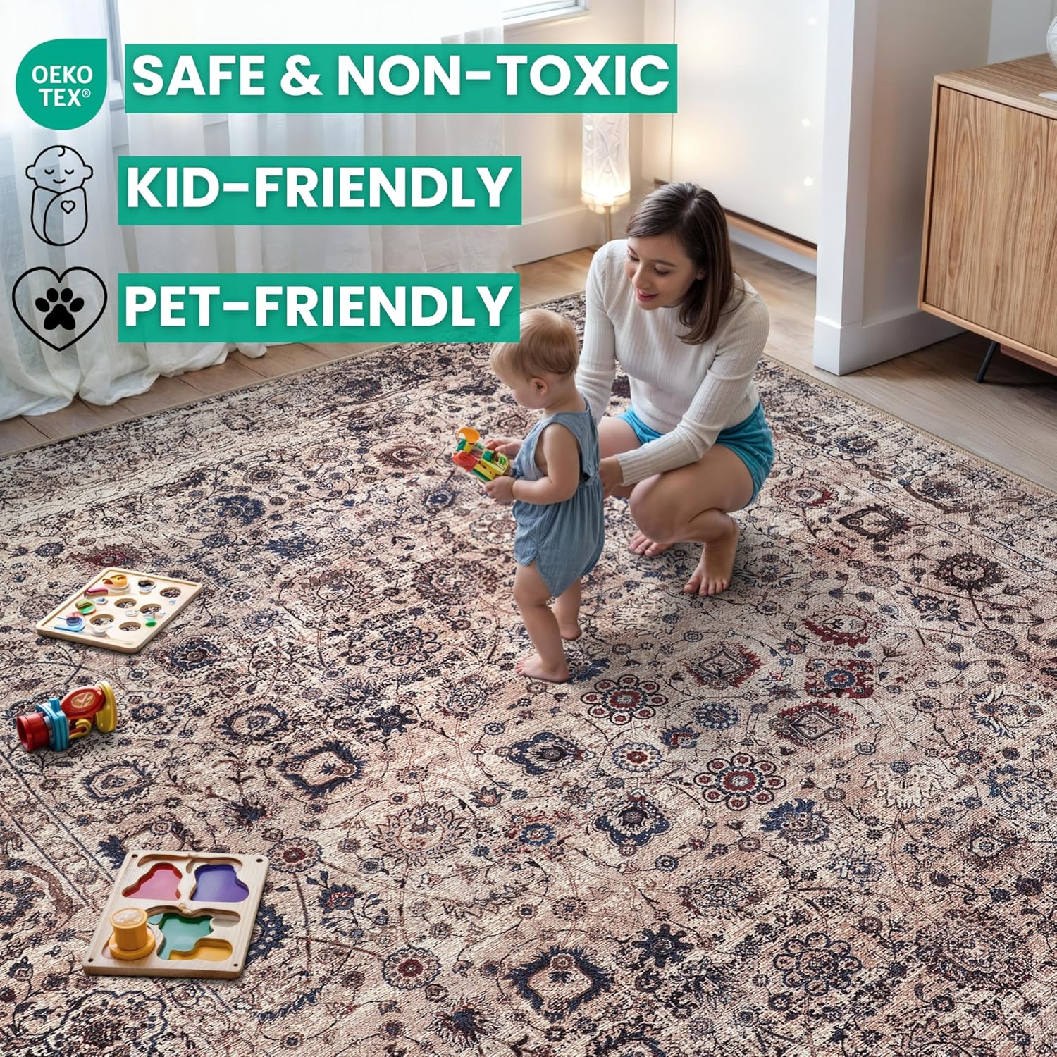 • MACHINE WASHABLE: Machine wash on delicate cycle (do not use bleach) at 85°F (30°C) and line dry or dry on air-only cycle without heat. Vacuum regularly and spot clean small stains. This easy to clean rug is perfect for families with kids and pets, and for high traffic areas.