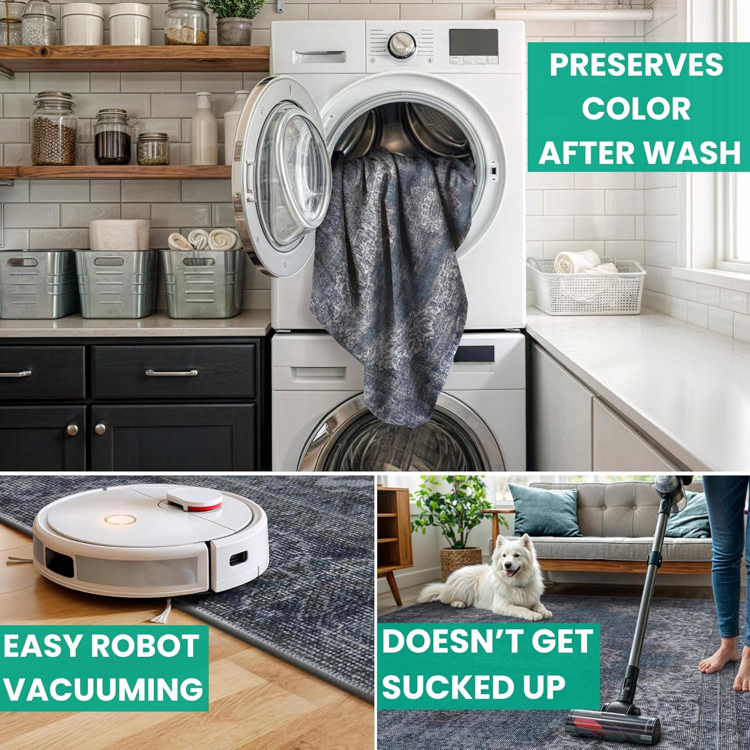 • MACHINE WASHABLE: Machine wash on delicate cycle (do not use bleach) at 85°F (30°C) and line dry or dry on air-only cycle without heat. Vacuum regularly and spot clean small stains. This easy to clean rug is perfect for families with kids and pets, and for high traffic areas.