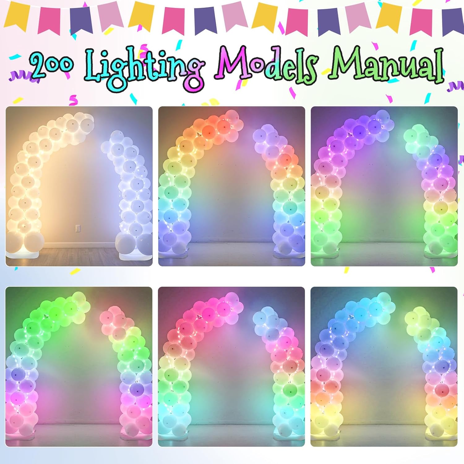 - .【Suitable for both day and night】To solve the problem that the balloon arch stand cannot be displayed well in a bad light environment at night, we combine the light strings with 200 light modes with the balloon stand (Batteries not included), which can achieve good effects at night. The white light can well restore the style of the balloon scene you want, and other modes can be adjusted as you want.