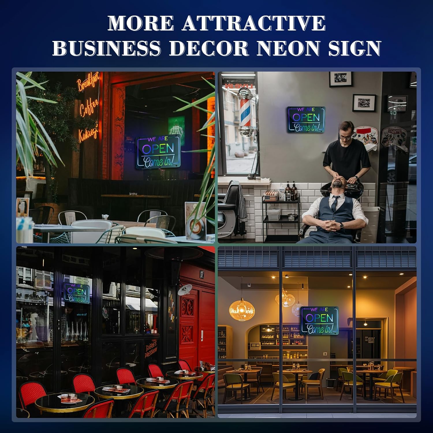 Ineonlife Open Neon Sign Come In We Are Open Mirrored Colorful LED lights for Business Decor Bright Led Light Signs Window Door Decoration Bar Shop Coffee Salon Store 14.57 x 11.02 inches USB Powerd