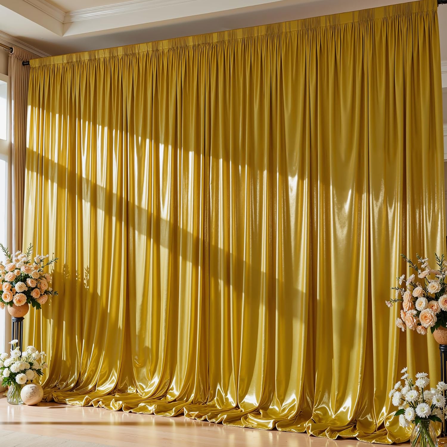 - 【Satin Backdrop Curtain】Our 10x10ft dark gold glitter backdrop curtain panels are perfect for adding a touch of glamour to any event. Made with thick, high-quality satin fabric, they shimmer beautifully without losing sequins, ensuring a stunning display. Each set includes two 5x10ft panels, providing ample coverage for weddings, parties, or photo shoots.
