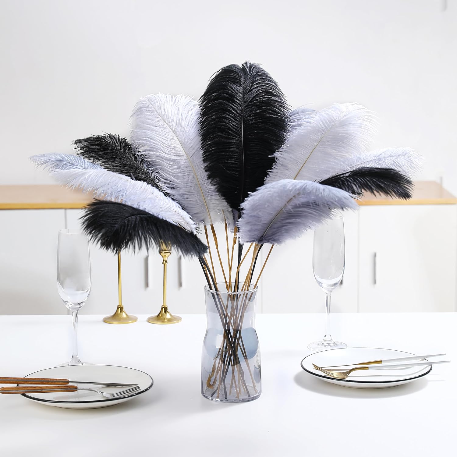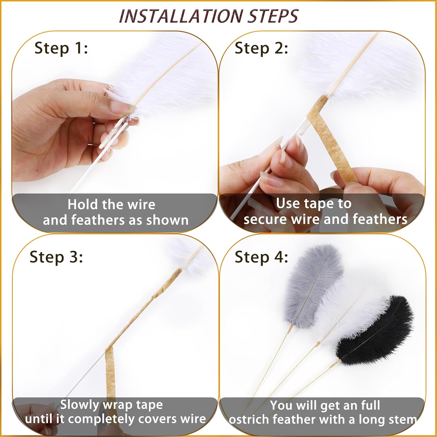 - 22inch Ostrich Feathrs Kit: 20pcs 10-12 inches black white and gray mixed ostrich feathers, 20 pcs 10 inches long iron wire, and a roll of 15m light brown tape. Rich set content to meet your decoration and use needs