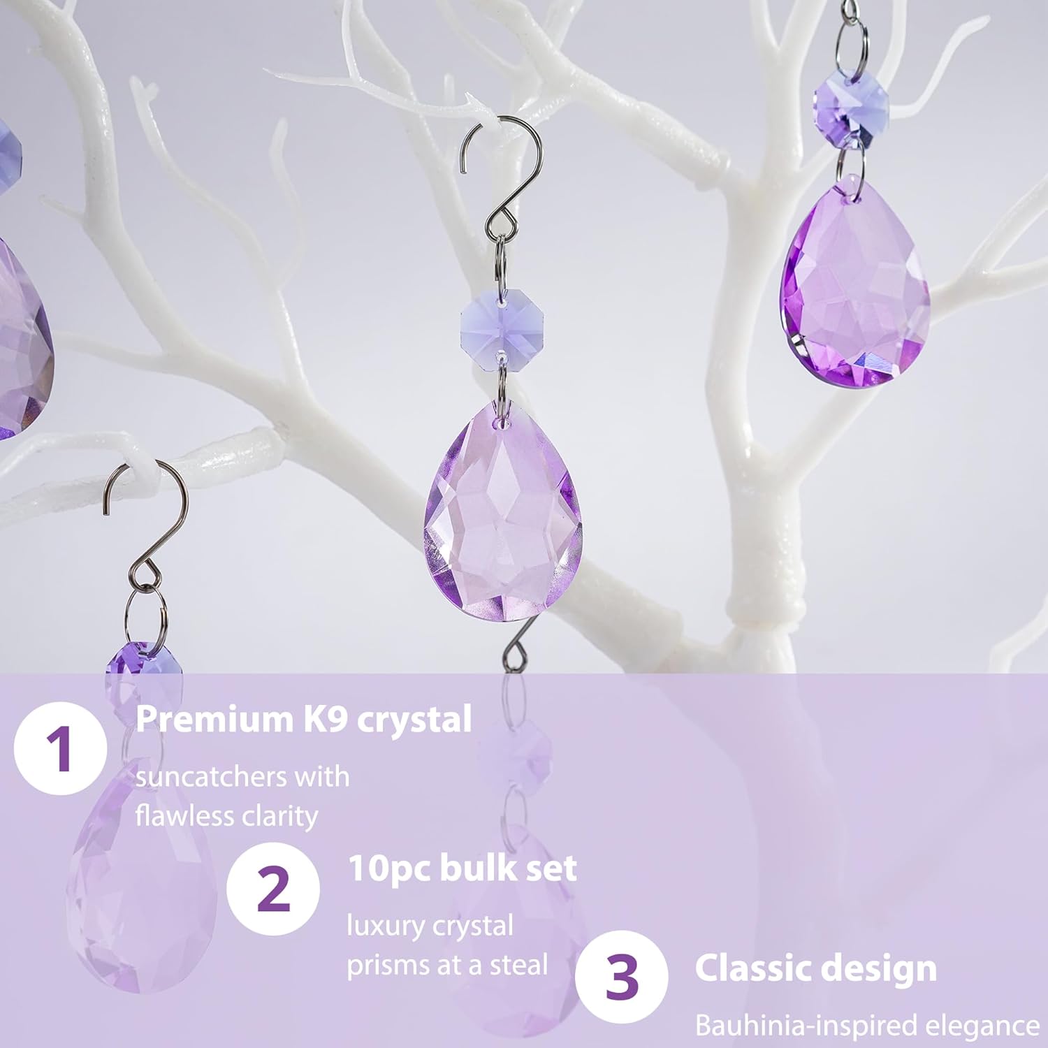 - Specifications: Color: Purple; Crafted from high-quality K9 Crystal. Bauhinia Bead Dimensions: 38 x 27 x 12.5mm (1.5 x 1 x 0.49 inches); Octagonal Bead Size: 14 x 7.5mm (0.55 x 0.3 inches). Total length reaches 87mm (3.4 inches). Each pack contains 10 exquisite Bauhinia Crystal Chandeliers