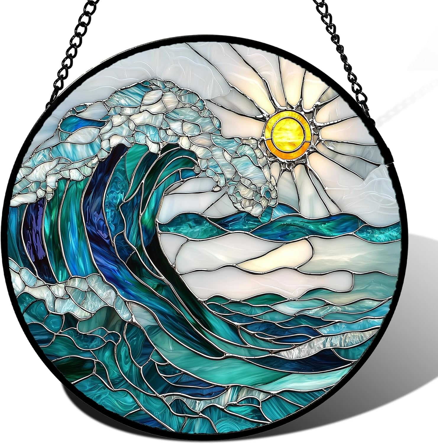 Stained Glass Window Hanging - Blue Green Waves Suncatcher for Door Terrace Garden Home Decor Sunrise Over The Sea Sun Catcher Birthday Gifts for Lovers Women Men Dad Mom Nana 15 in