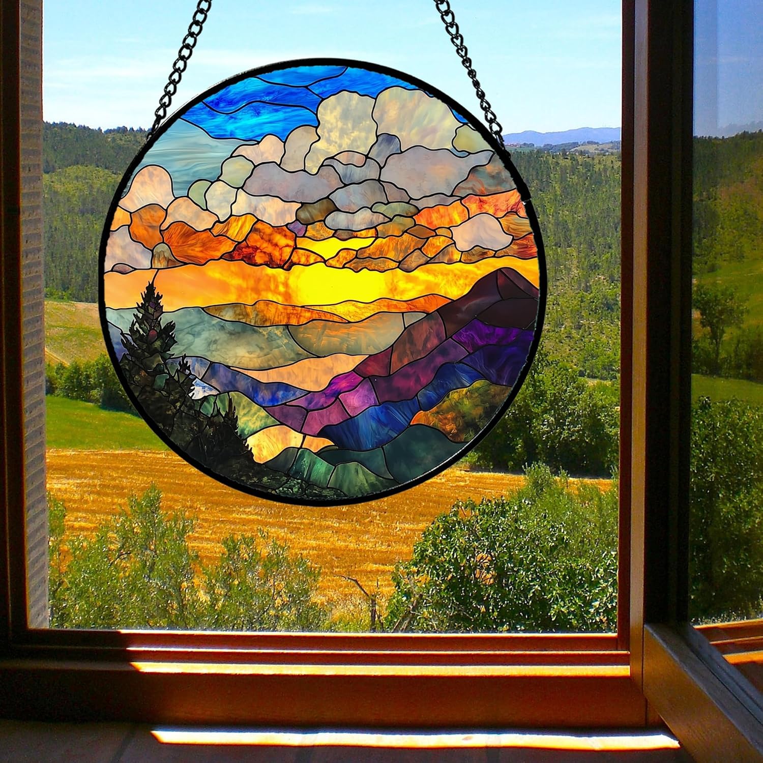 Stained Glass Window Hanging, Abstract Clouds Mountains Landscape Suncatcher for Doors Window Home Sun Catchers Decor Mother's Day Birthday Gifts for Women, Men Mom 11.8 in