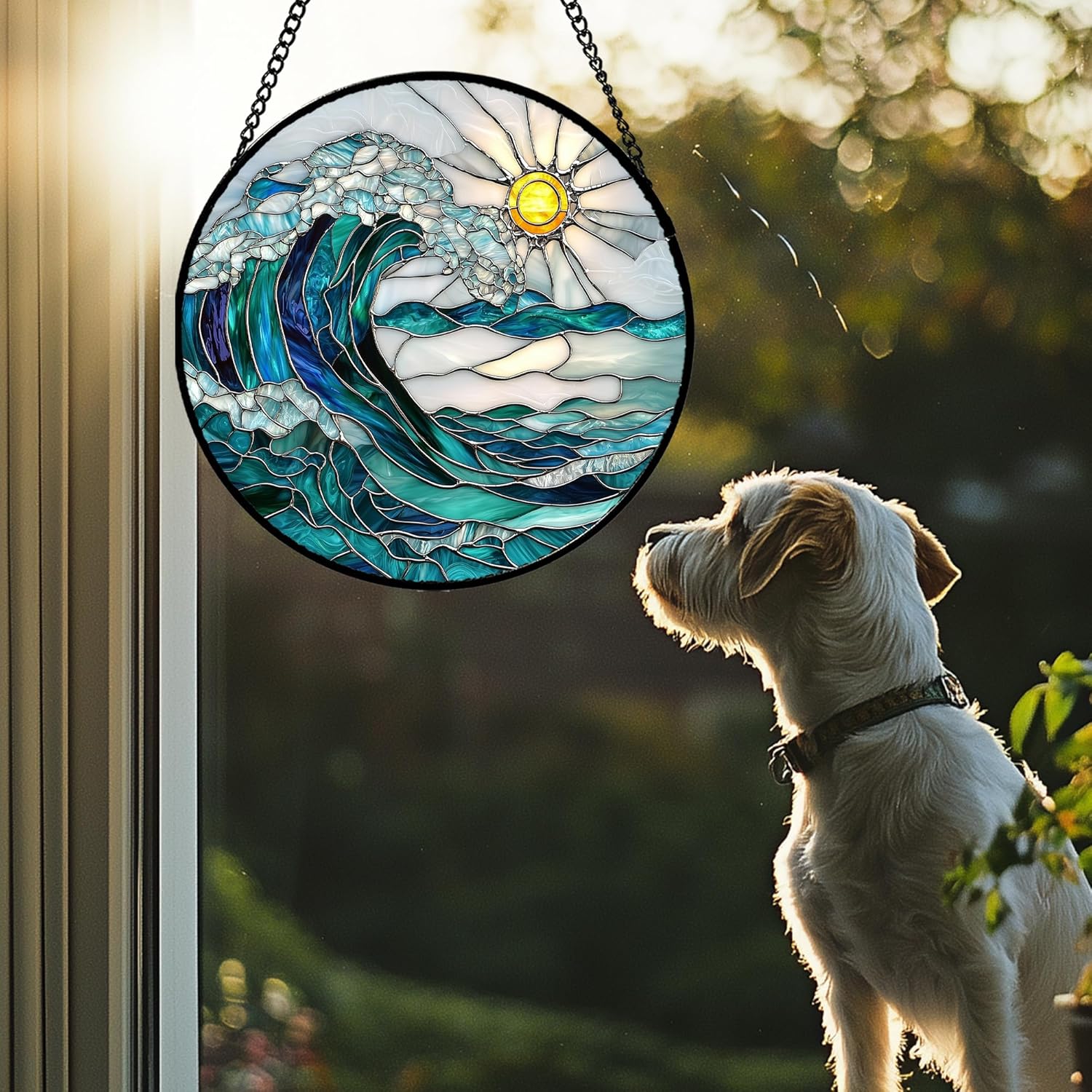 Stained Glass Window Hanging - Blue Green Waves Suncatcher for Door Terrace Garden Home Decor Sunrise Over The Sea Sun Catcher Birthday Gifts for Lovers Women Men Dad Mom Nana 6.3 in