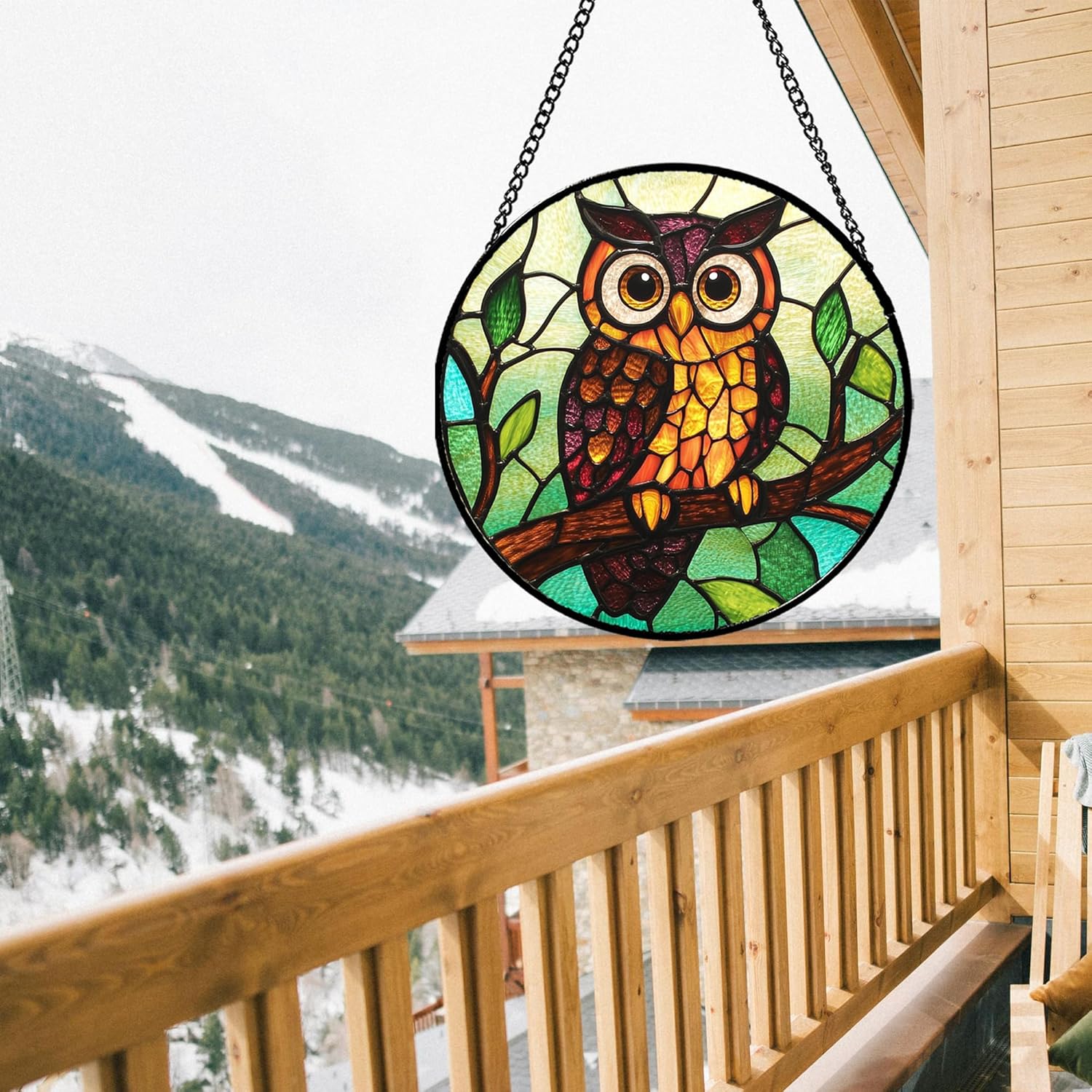 Stained Glass Window Hanging - Owl on a Branch Suncatcher for Doors Window Home Orange Brown Sun Catchers Decor Christmas Mother's Day Birthday Gifts for Teacher Women Men Mom Nana 9.8 in