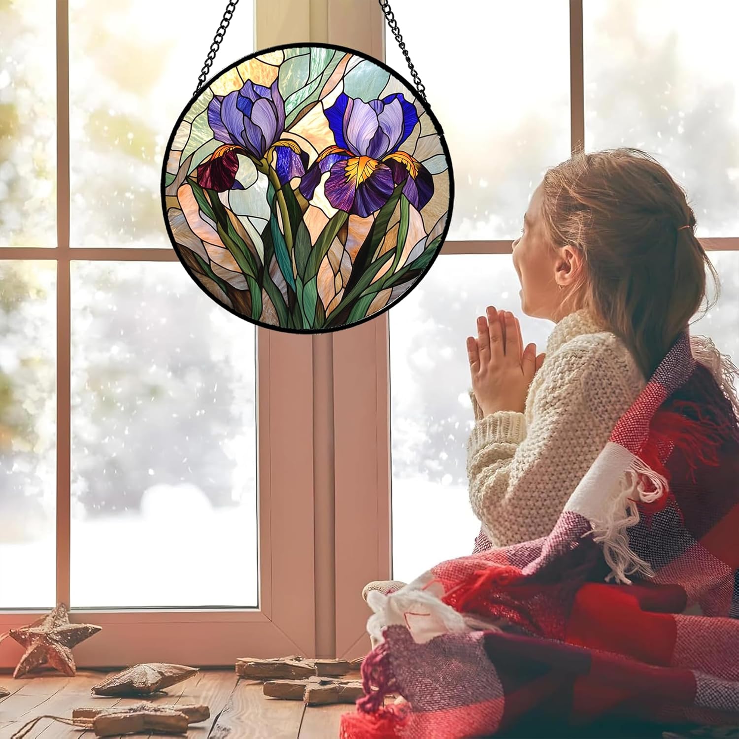 Stained Glass Window Hanging, Purple Blue Iris Birth Flower Suncatcher for Doors Garden Yard Sun Catchers Decor Christmas Mother's Day Birthday Gifts for Teacher Women Mom Nana Wife 6.3 in