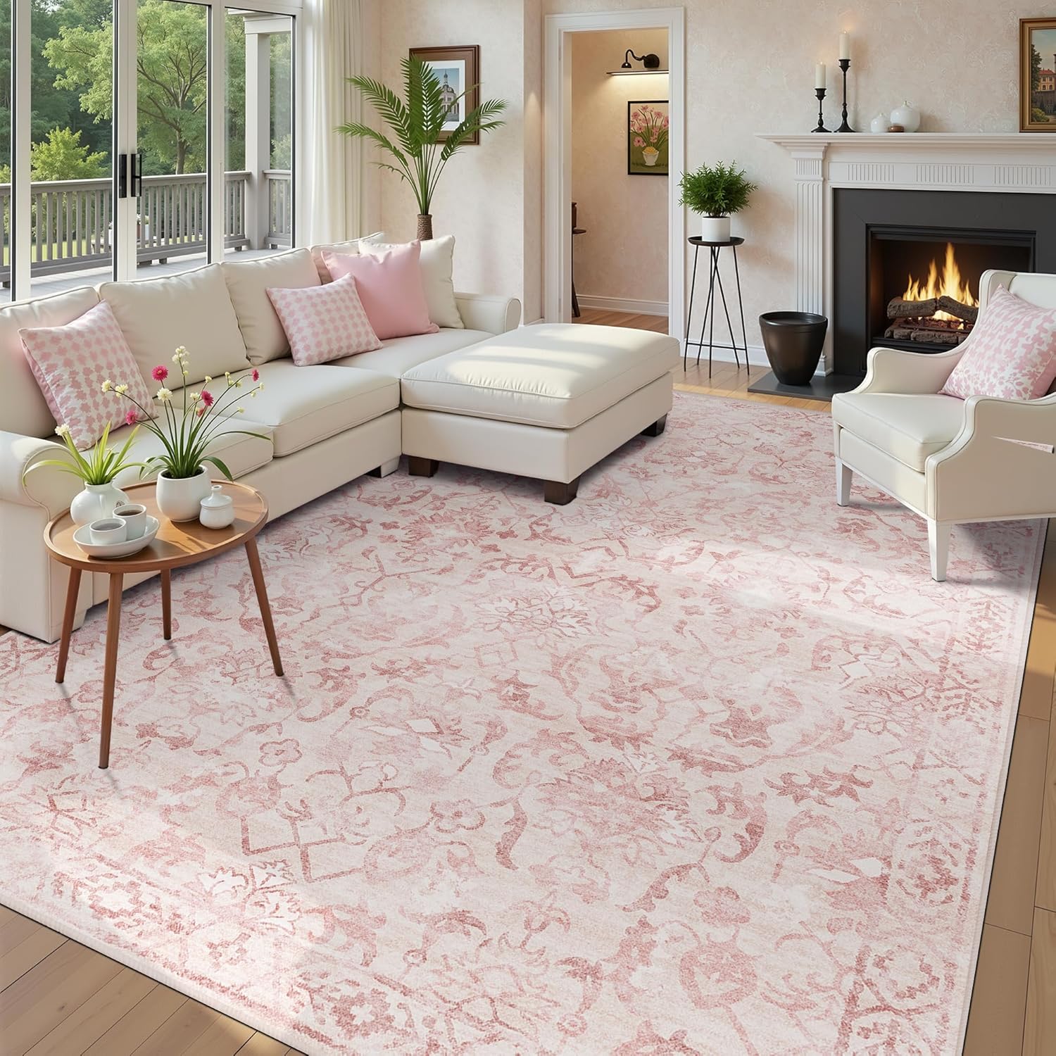 Pink Area Rugs 7x9 for Living Room, Washable Vintage Rugs for Bedroom, Distressed Throw Rug, Non Slip Rug Carpet for Bedroom Dining