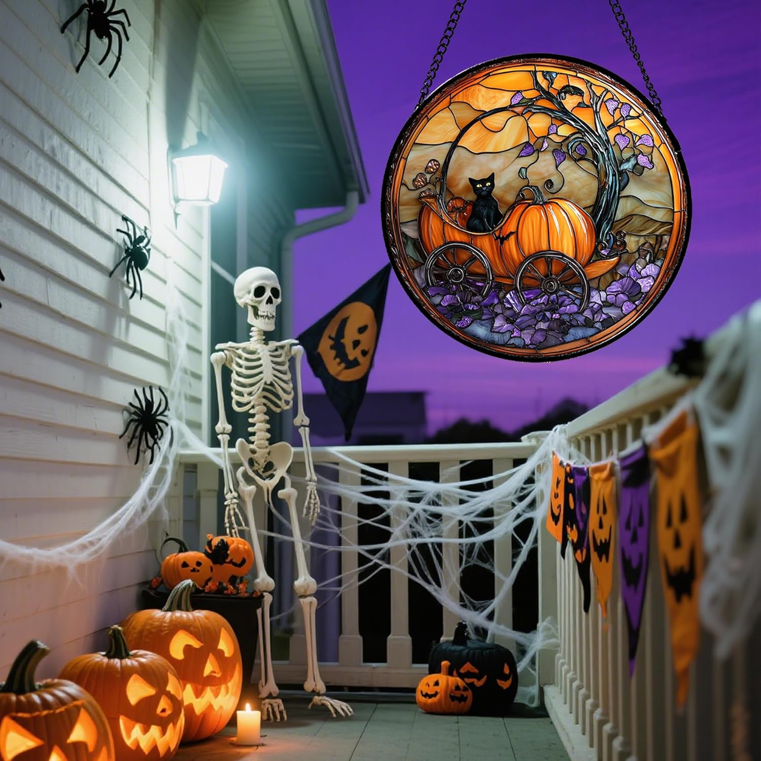 Stained Glass Window Hanging - Halloween Pumpkin Carriage Black Cat Suncatcher for Doors Window Garden Spooky Sun Catchers Gothic Decor Horror Gifts for Women Men Friend Boy Girl 11.8 in