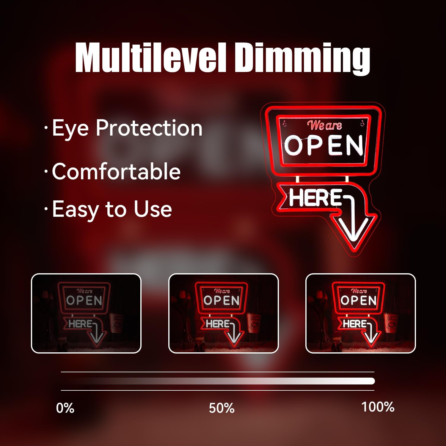 - UNIQUE DESIGN:The Neon lights are designed with the perfect combination of arrow and text "we are open here",bold and charming, easily becoming the visual focus in the space.Whether placed on a desktop, bookshelf, or hung on a wall or window, it can instantly light up the space without being bulky